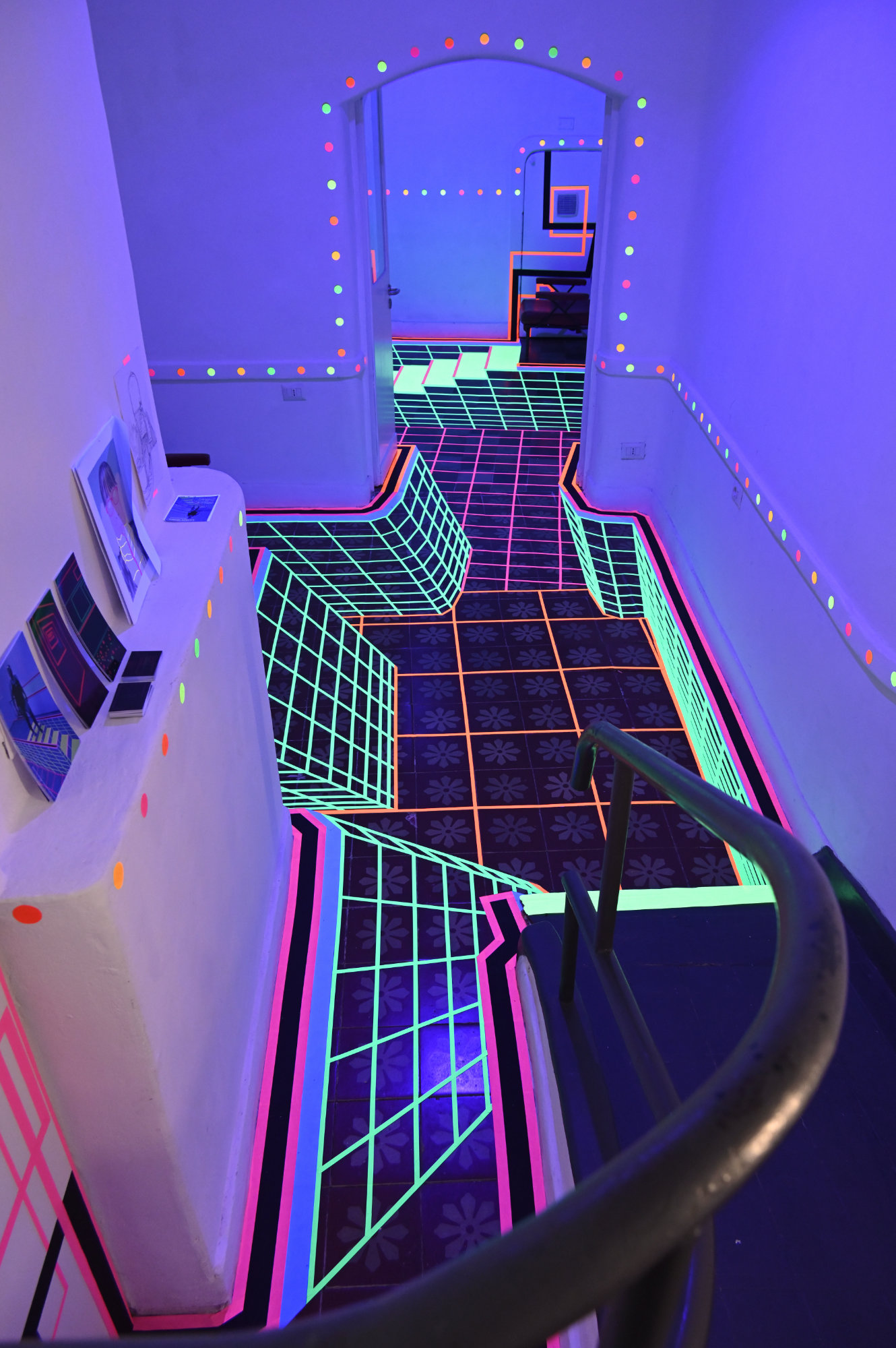 piscina alternativa, 2025 In Situ Arbeit Tapes, Neontapes, Punkte, Schwarzlicht, Sound Fotos von mir und Valentina Piredda |